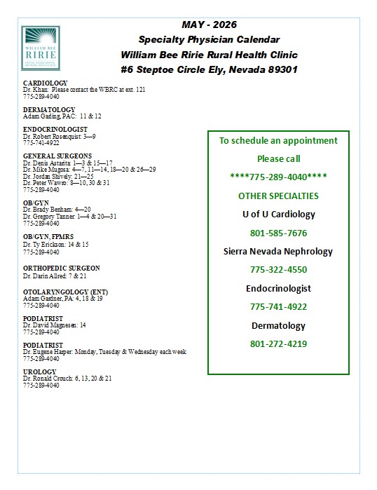 To make an appointment please call William Bee Ririe Rural Health Clinic at 775-289-4040